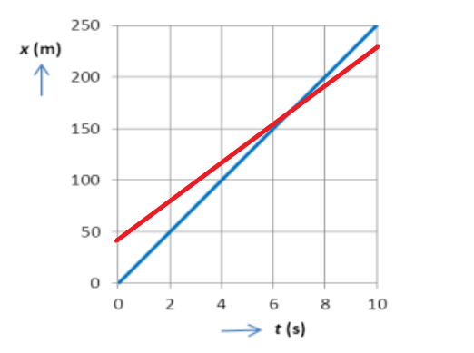B) dat kun je zien doordat de blauwe lijn die de van de blauwe auto is om de seconde, 5 meter verwijderd (steiler) wordt van de rode lijn die de rode auto moet voorstellen.